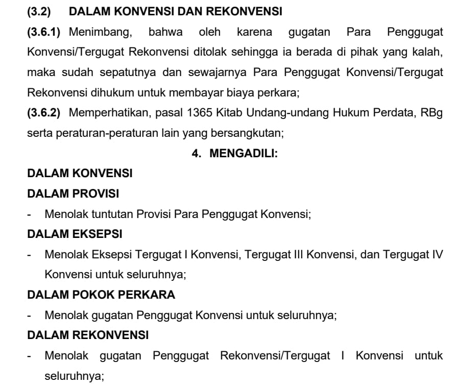 - Menolak tuntutan Provisi Para Penggugat Konvensi