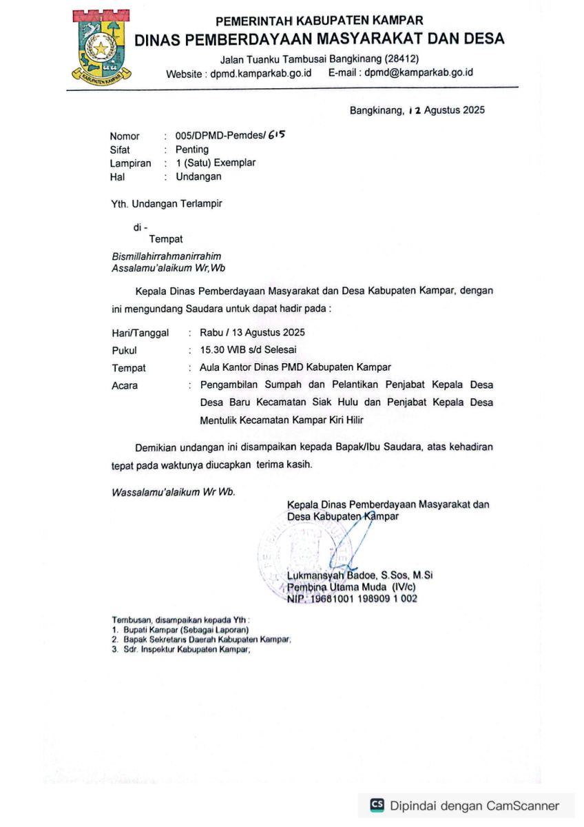 Merespons berbagai polemik dan desakan warga, Bupati Kampar Ahmad Yuzar akhirnya mencopot Penjabat (PJ) Kepala Desa Baru. Hal ini terungkap melalui surat resmi Dinas Pemberdayaan Masyarakat dan Desa (PMD) Kabupaten Kampar bernomor 005/DPMD-Pemdes/615 tertanggal 12 Agustus 2025, yang berisi undangan pelantikan Penjabat Kepala Desa Baru dan Penjabat Kepala Desa Mentulik pada Rabu, 13 Agustus 2025 di Aula Kantor Dinas PMD Kampar. Surat yang ditandatangani Kepala Dinas PMD Kampar, Lukmansyah Badoe, S.Sos, M.Si, dengan tembusan kepada Bupati, Sekda, dan Inspektur Kabupaten Kampar itu menegaskan pergantian pimpinan desa sebagai langkah tindak lanjut.