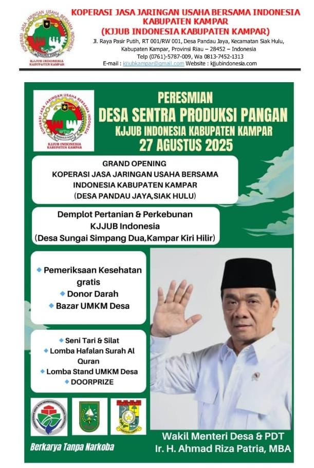 Kampar – Koperasi Jasa Jaringan Usaha Bersama Indonesia (KJJUB Indonesia) Kabupaten Kampar siap menggelar Grand Opening dan Peresmian Desa Sentra Produksi Pangan pada Rabu, 27 Agustus 2025. Acara besar ini akan diresmikan langsung oleh Wakil Menteri Desa dan Pembangunan Daerah Tertinggal (Wamendes PDTT), Ir. H. Ahmad Riza Patria, M.B.A., yang juga menjabat sebagai Ketua Pengawas KJJUB Indonesia.