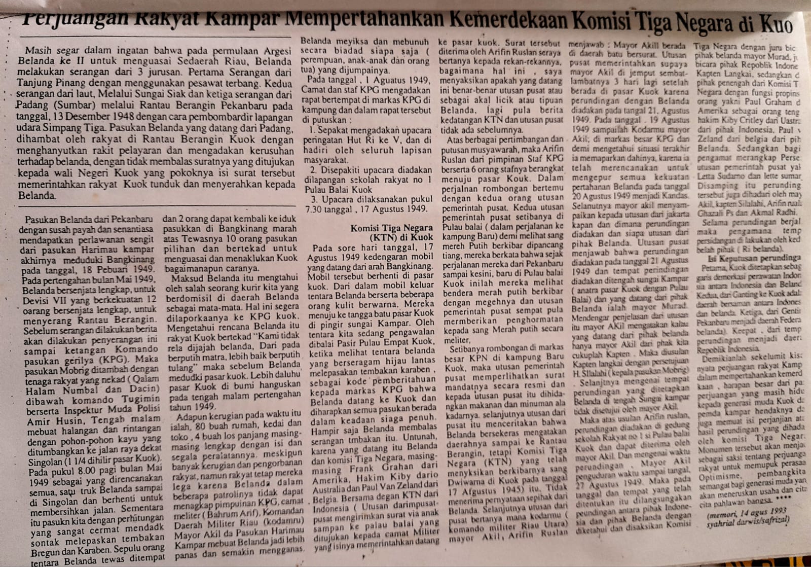 BANGKINANG — Peristiwa heroik rakyat Kuok, Kabupaten Kampar, Riau, dalam mempertahankan kemerdekaan Republik Indonesia dari agresi Belanda II pada tahun 1948–1949, meninggalkan catatan penting dalam sejarah bangsa. Bahkan, Komisi Tiga Negara (KTN) yang menjadi penengah dalam konflik Indonesia–Belanda kala itu, pernah menyaksikan langsung perjuangan rakyat di Kuok.