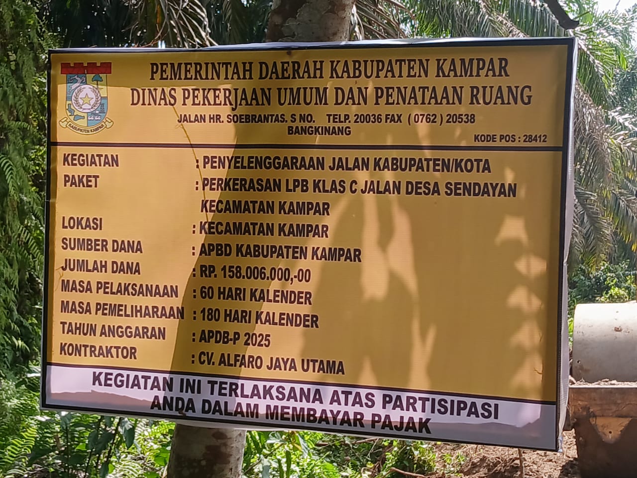 KAMPAR — Kekisruhan terjadi di Desa Sendayan, Kecamatan Kampar, setelah warga menemukan proyek Perkerasan LPB Klas C yang bersumber dari APBD-P Kabupaten Kampar 2025 senilai Rp158.006.000 dikerjakan bukan pada titik yang mereka usulkan. Proyek tersebut dikerjakan oleh CV Alfaro Jaya Utama dengan masa pelaksanaan 60 hari kalender.