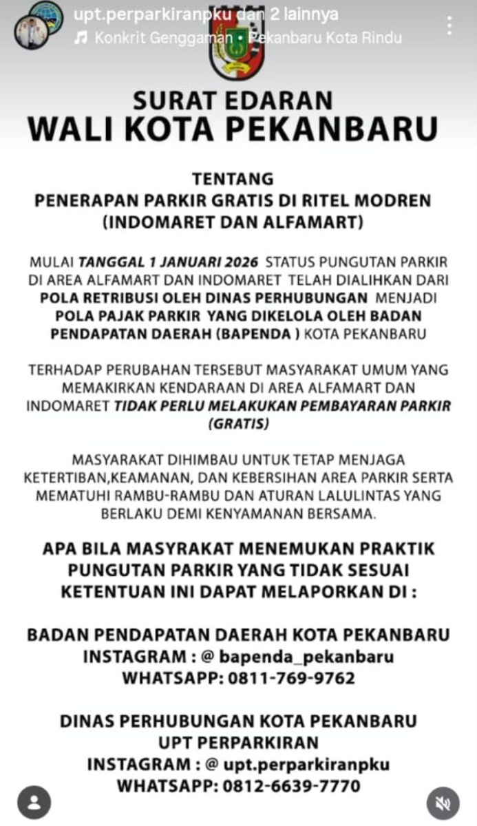 Dalam surat edaran tersebut dijelaskan, status pungutan parkir di Indomaret dan Alfamart dialihkan dari sebelumnya berbentuk retribusi yang dikelola Dinas Perhubungan menjadi pajak parkir yang dikelola Badan Pendapatan Daerah (Bapenda) Kota Pekanbaru. Dengan perubahan pola ini, masyarakat tidak lagi dibebankan pembayaran parkir saat berbelanja di dua jaringan ritel tersebut.