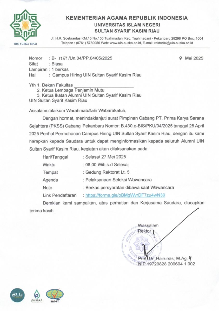 Pekanbaru — Universitas Islam Negeri (UIN) Sultan Syarif Kasim Riau kembali membuka peluang kerja bagi para alumninya melalui kegiatan Campus Hiring yang akan digelar pada Selasa, 27 Mei 2025. Acara ini merupakan hasil kerja sama dengan PT. Prima Karya Sarana Sejahtera (PKSS) Cabang Pekanbaru.